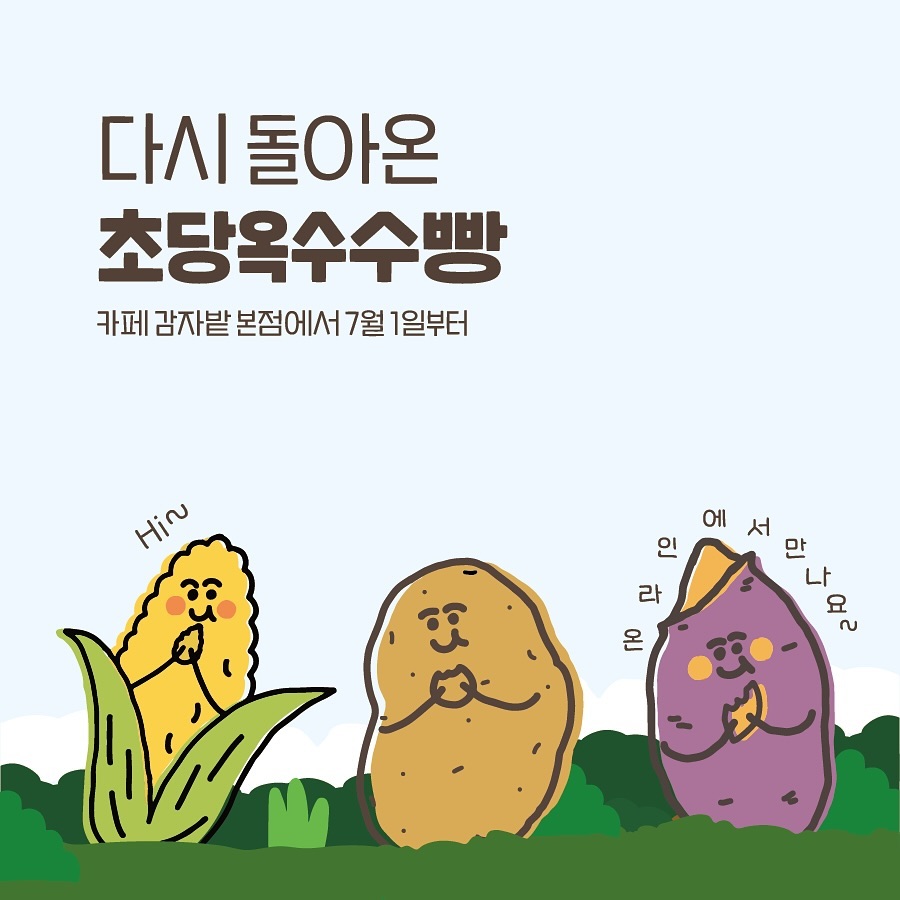 옹심이들이 기다리고 기다려주셨던초당옥수수빵이 7월1일 오늘부터카페감자밭 본점에서 만나볼 수 있습니다 .ᐟ수많은 테스트를 거쳐 이전보다 더 풍미있는 맛으로 찾아왔으니옹심이들 맞이 할 준비 하고 있을게요 👉🏻👈🏻군고구마빵은 온라인몰에서 만나요 🍠