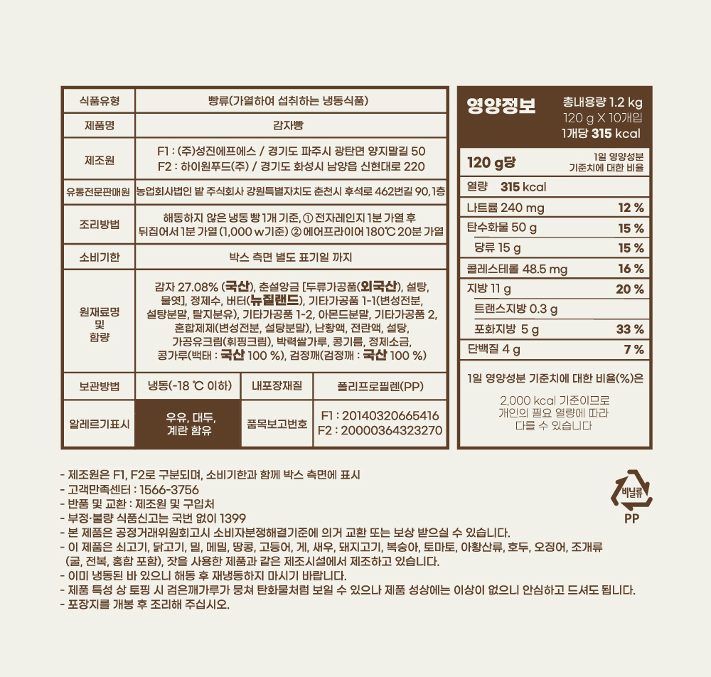 F1 : ㈜성진에프에스 / 경기도 파주시 광탄면 양지말길 50 F2 : ㈜하이원푸드 / 경기도 화성시 남양읍 신현대로 220